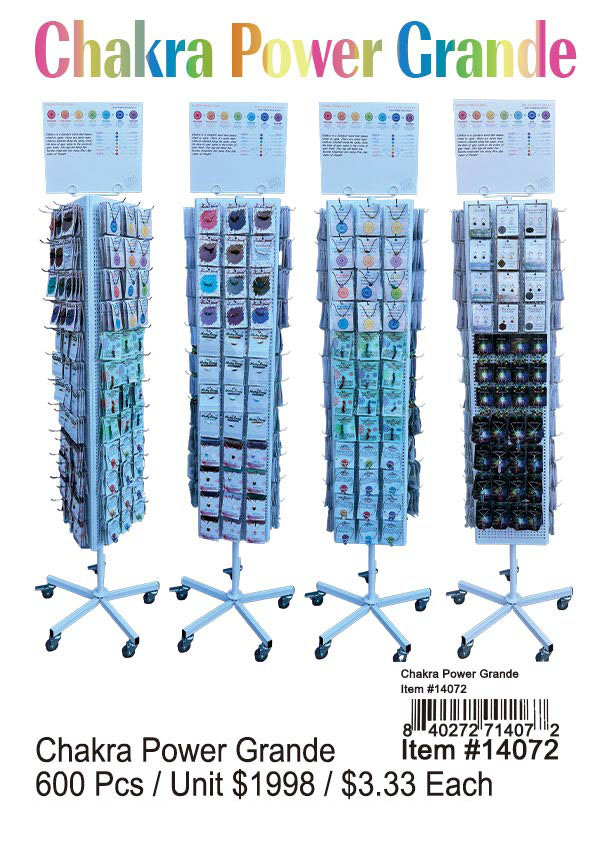 Presenting Chakra Power Bracelets & Necklaces, a harmonious blend of gemstones for balance and healing. With 600 quality pieces displayed on a three-sided floor stand, each bracelet and necklace is meticulously crafted from premium raw materials. Embrace the power of chakras and promote harmony in your life with these beautifully designed accessories.